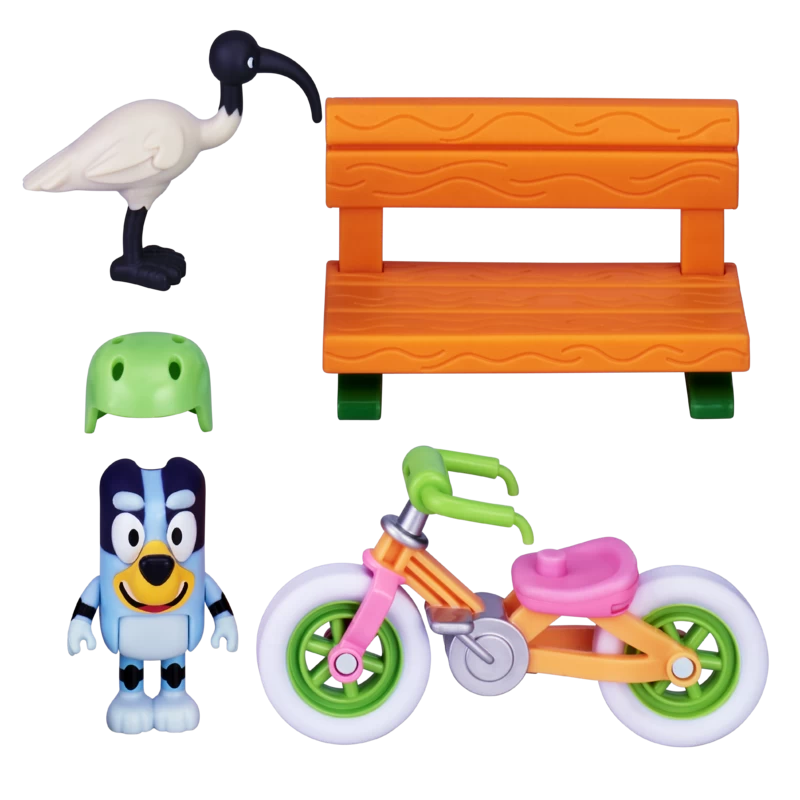 Includes: 1 x Bluey Figurine, 1 x Bicycle, 1 x Helmet, 1 x Park Bench and 1 x Bin Chicken.