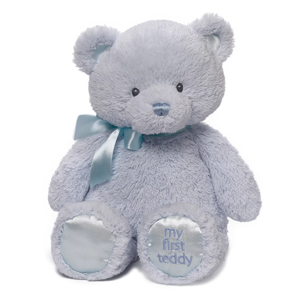 My First Teddy is crafted of super-soft plush, has satin paws, an organza ribbon around her neck, an embroidered nose.