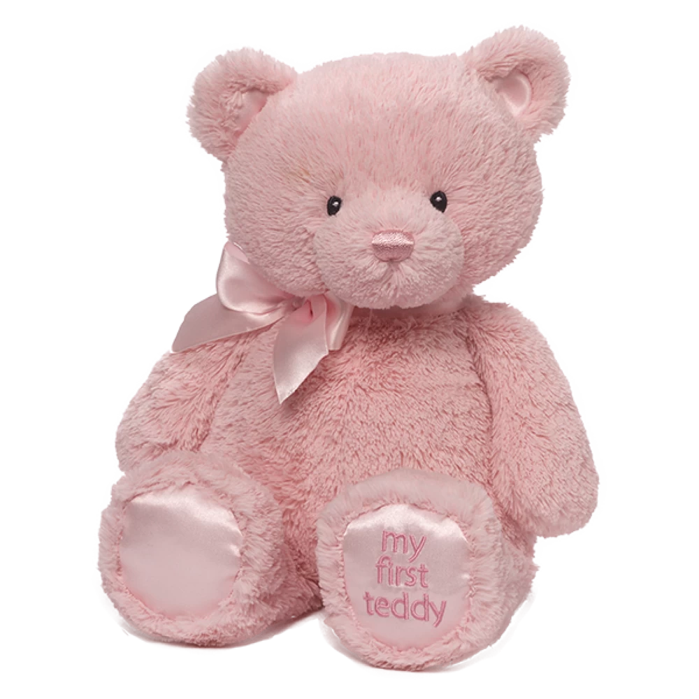 My First Teddy is crafted of super-soft plush, has satin paws, an organza ribbon around her neck, an embroidered nose.