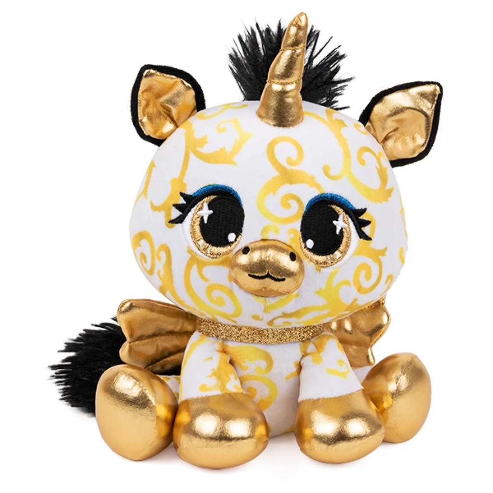 This fashion-inspired unicorn is made from luxe, premium fabrics and features soft embroidered eyes with signature “twinkle” design, luscious lashes, fluffy tail, foiled ears and eye-catching sparkly gold collar.