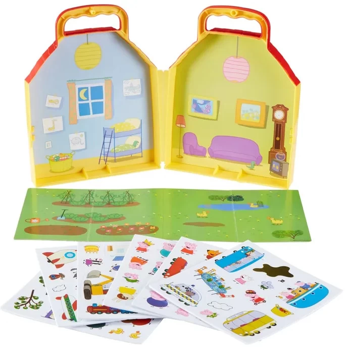Open the house carry case to find a Peppa Pig scenic background and 100 reusable foam stickers, featuring lots of characters and accessories.